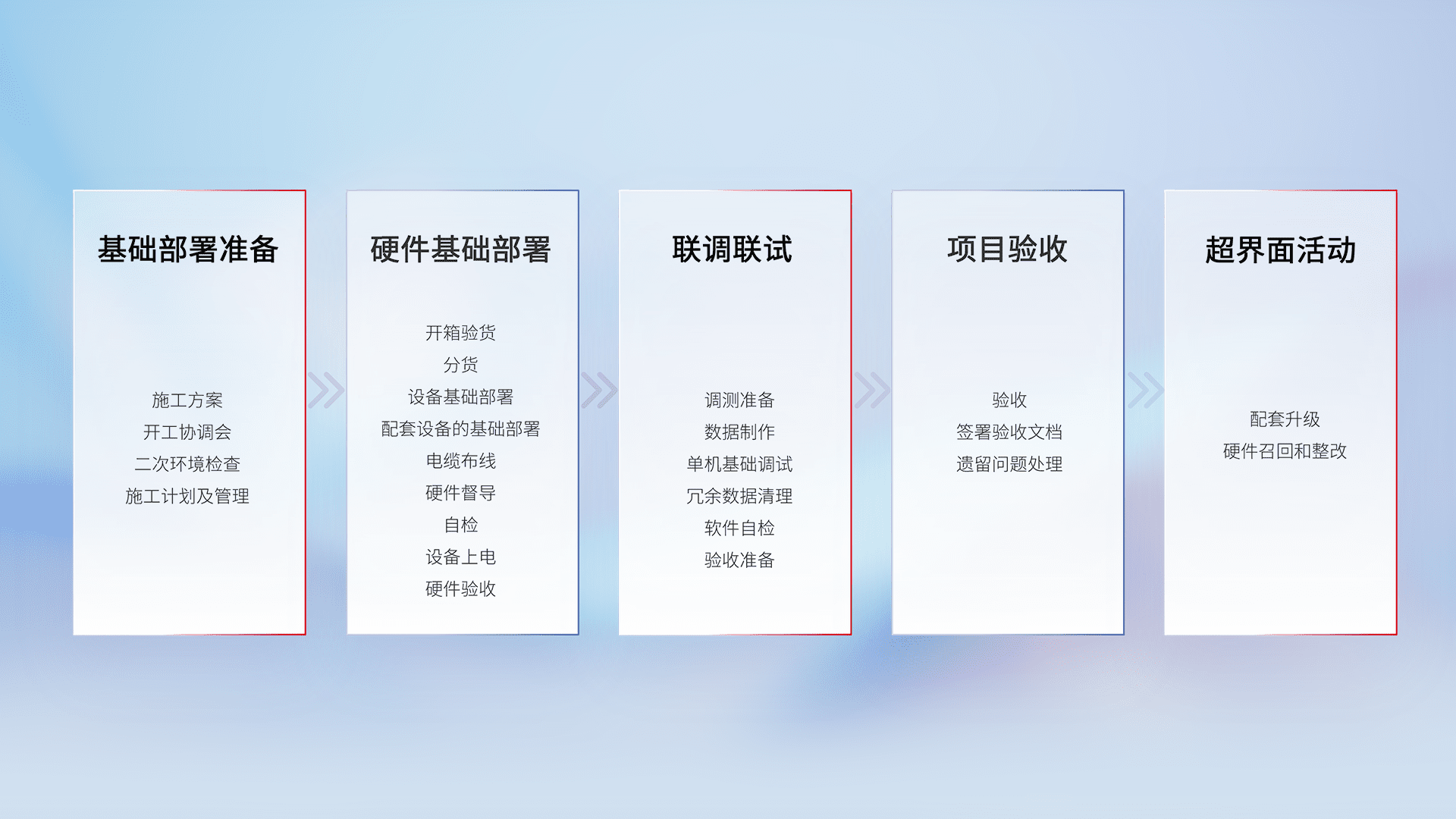 从基础部署准备、、硬件基础部署、、联调联试、、、、项目验收、、、、越界面活动的全过程可追溯,,,,保证施工质量和进度。。。